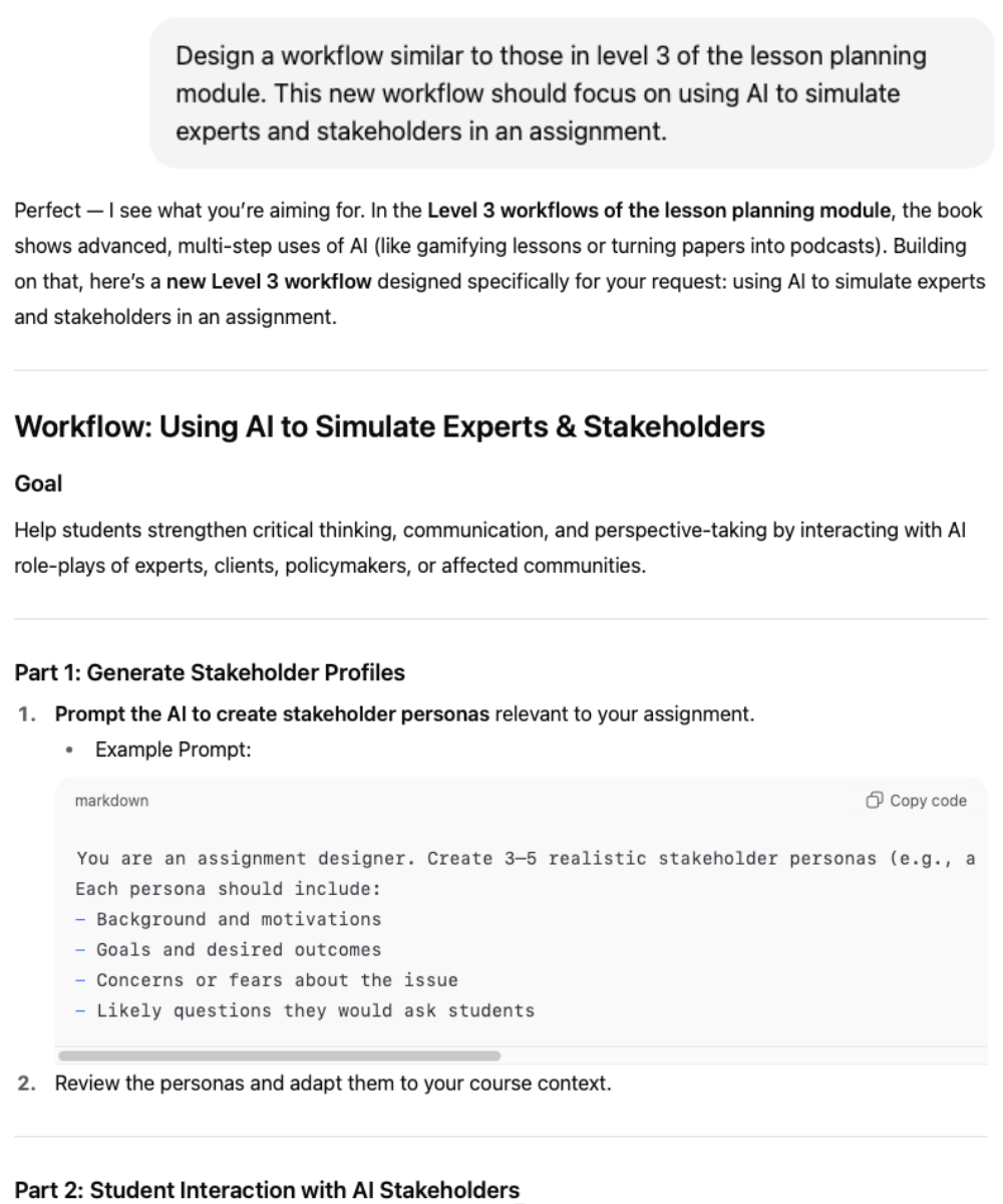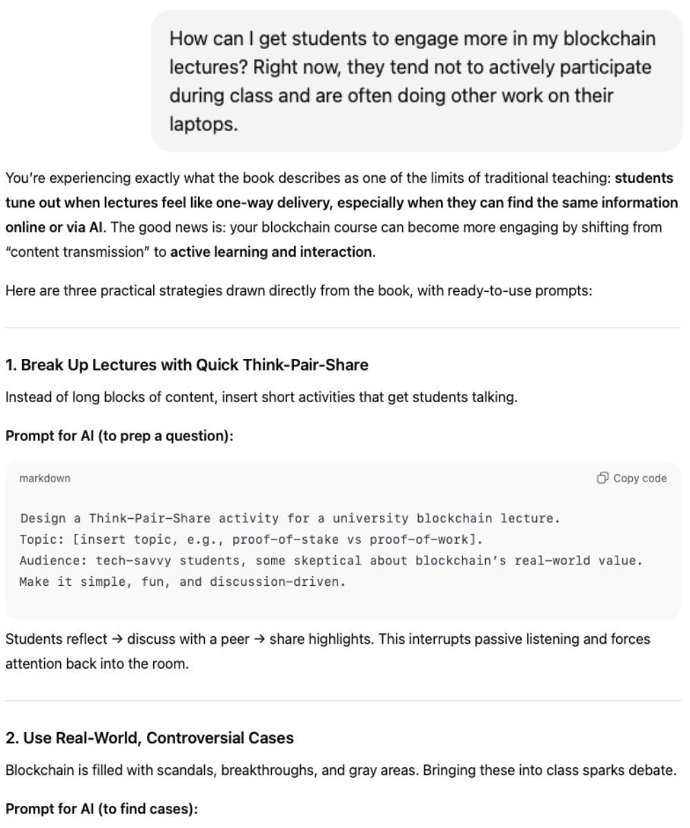 Data and privacy: As with any AI tool, be thoughtful about what you share. Avoid pasting sensitive student data, confidential institutional information, or anything you wouldn’t want processed by a third-party system. For general pedagogical advice, lesson planning, and understanding concepts from the book, this assistant can be incredibly helpful.