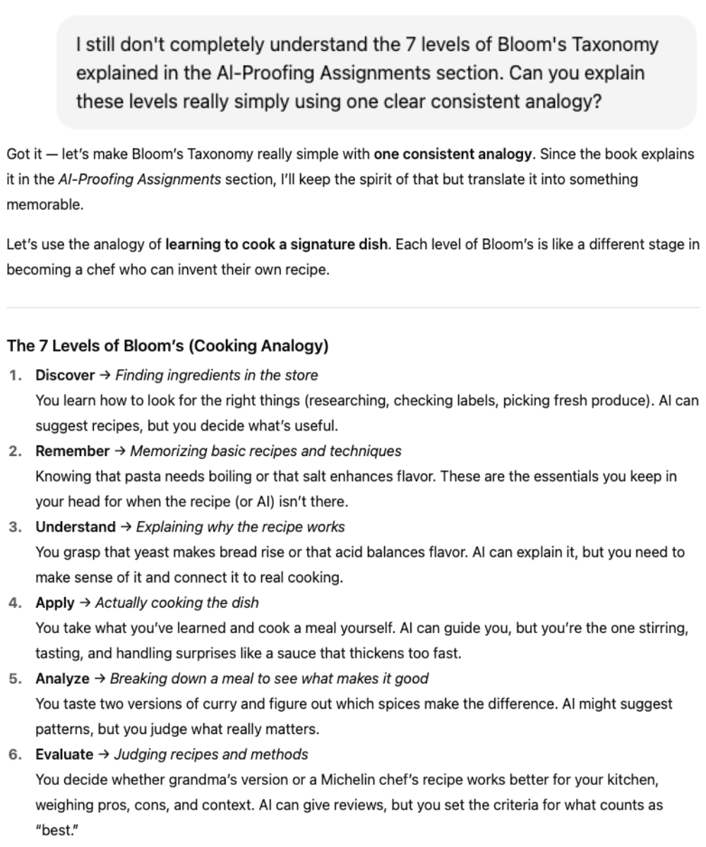 If a concept in the book isn’t clear, ask the assistant to re-explain it in simpler terms, provide an example, or connect it to your specific teaching context.