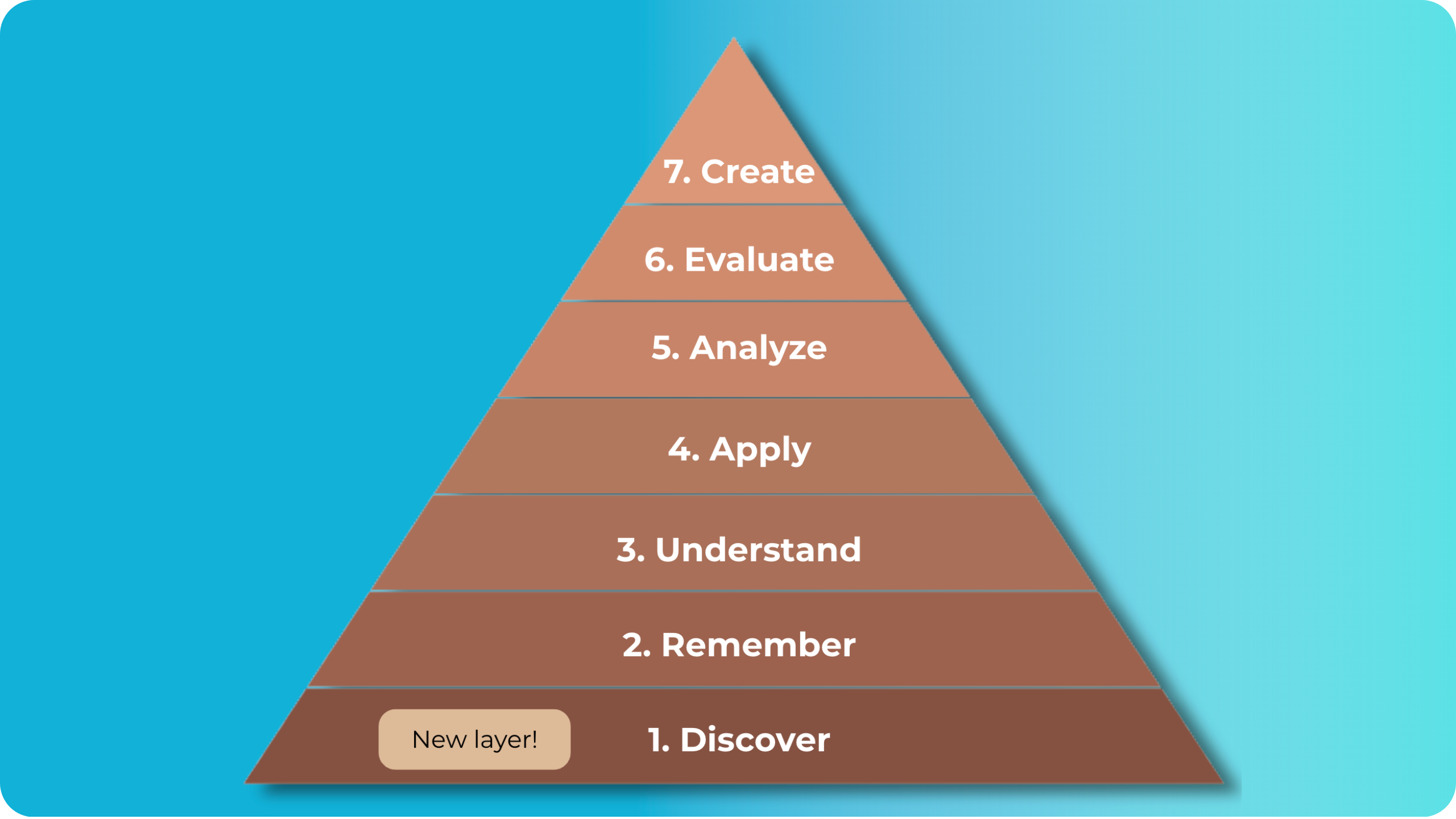 Discover sits at the foundation because finding and evaluating information through AI has become as fundamental as memorization once was. While Discover involves sophisticated skills like evaluating credibility and strategic searching, it sits at the base of the pyramid because without quality information, students cannot meaningfully remember, understand, or create anything with AI.